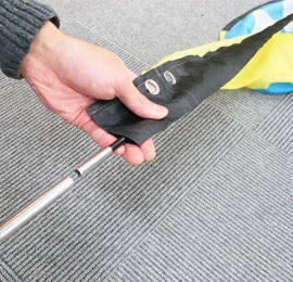 ポールを連結せずに最も細い先頭部分を持ちます。先端から順番に、オーダーメイドでプリントした旗の棒袋部分に挿入していきましょう。せっかく特注で作成したメディア印刷面を傷つけないよう、ゆっくりと入れていきます。